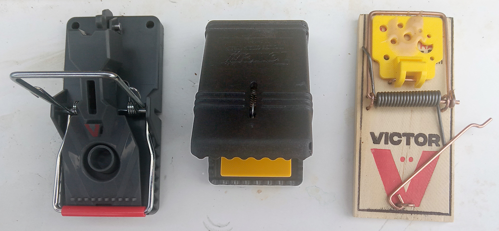 The second and third pictures show a "live catch" mouse trap. It didn't catch anything. But I don't know if that is because the bait I put in there attracted more ants than mice. Maybe the mice stayed away because of the ants. The third trap in the first picture (the 100 year old style of trap) didn't catch anything. But it could have been due to how I set the trap. I might not have left enough "travel" room for the tripping pad. I'll be more careful to be sure I'm setting it propery next time.